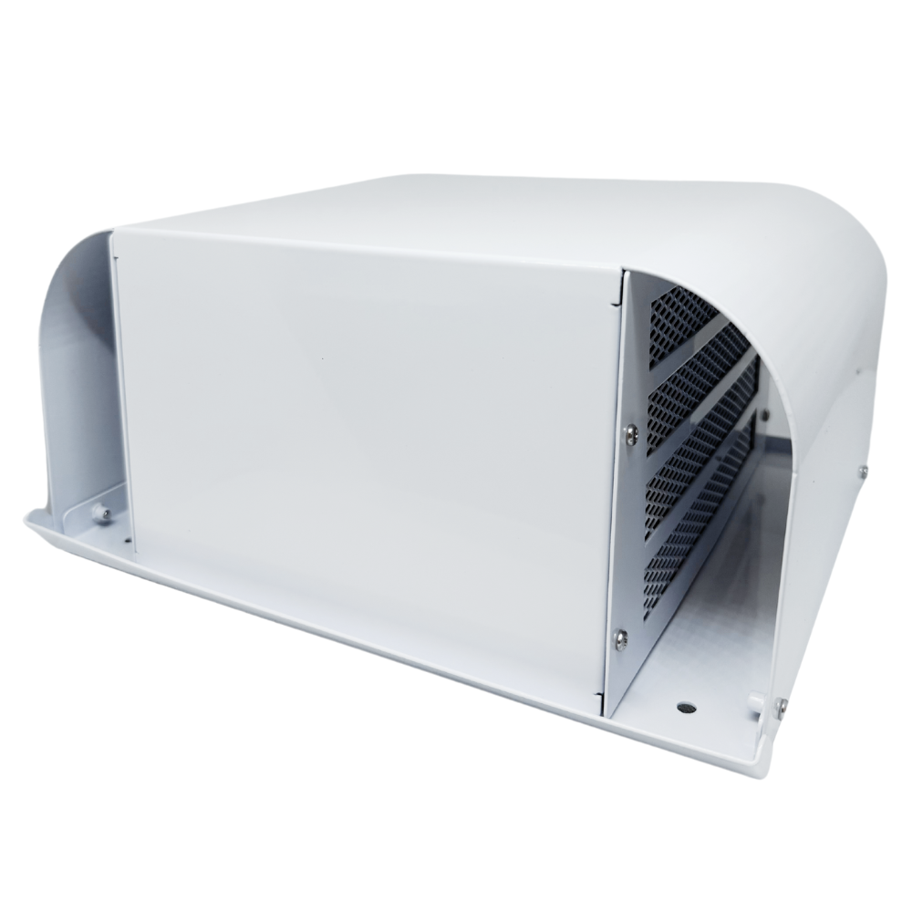 Med sit forlængede design rækker regnskjoldet længere ud fra væggen, hvilket giver optimal beskyttelse mod vind og vejr. Den skrå hældning forhindrer regnvand i at trænge ind og sikrer, at dit ventilationssystem fungerer effektivt under alle forhold.